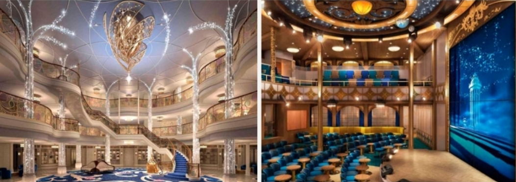 디즈니 위시 내부는 더욱 매력적인데요, 선내 어디에서나 디즈니 캐릭터를 만날 수 있어요. '겨울 왕국 2' 테마의 식당에서는 안나와 크리스토프의 왕실 약혼 파티를 콘셉트로 하고 있고요, '마블 월드'에서는 어벤저스 영화에서 영감을 받은 메뉴들을 즐길 수 있어요. 재미있는 사실은, 앤트맨이 영화처럼 음식 크기를 줄여준다고 해요!